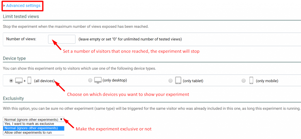 Once you’ve set the segmentation you can see that under “Advanced settings” link, in the second part of the page, you can add a maximum number of users that will see the experiment (once that number is reached the experiment will stop) and select the devices where you want the A/B test to be visible.