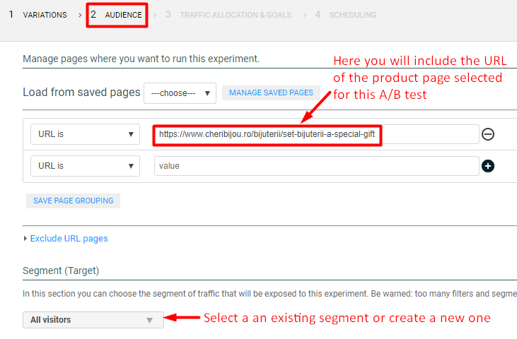 If you want to apply the experiment on all the product pages, you can do this by inserting into the Audience tab only the part of the URL that is common to all the product pages and using the URL CONTAINS condition.