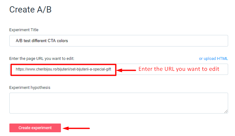 Here you can either load the URL of the product page that you desire to include into your experiment or add its HTML source code.