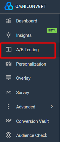 From the main left menu select the A/B Testing option: