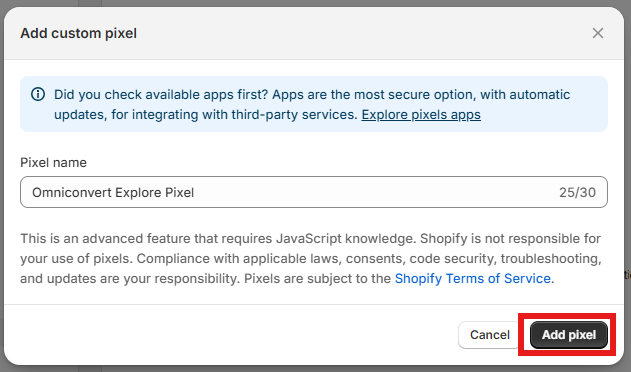 Choose a name for the custom pixel. In this case, we will go with Omniconvert Explore Pixel. Then press the Add pixel button.