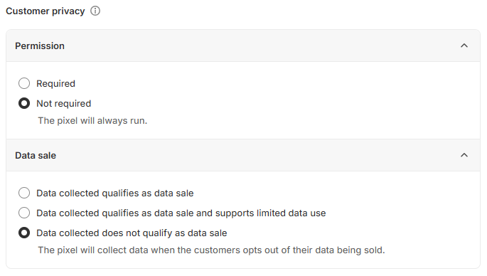 Set up your customer privacy. The recommended Customer Privacy Settings of the pixel are: