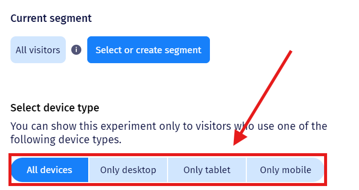 You can also customize the segmentation by the Device type, meaning only visitors using the specified device will be able to see the experiment.