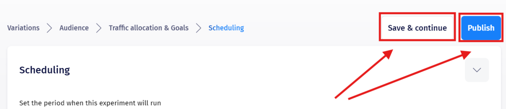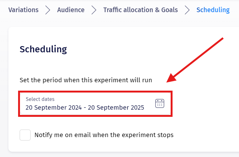The last step of setting up an A/B test experiment is to Schedule it. Here you can select the timeframe when the experiment will take place.