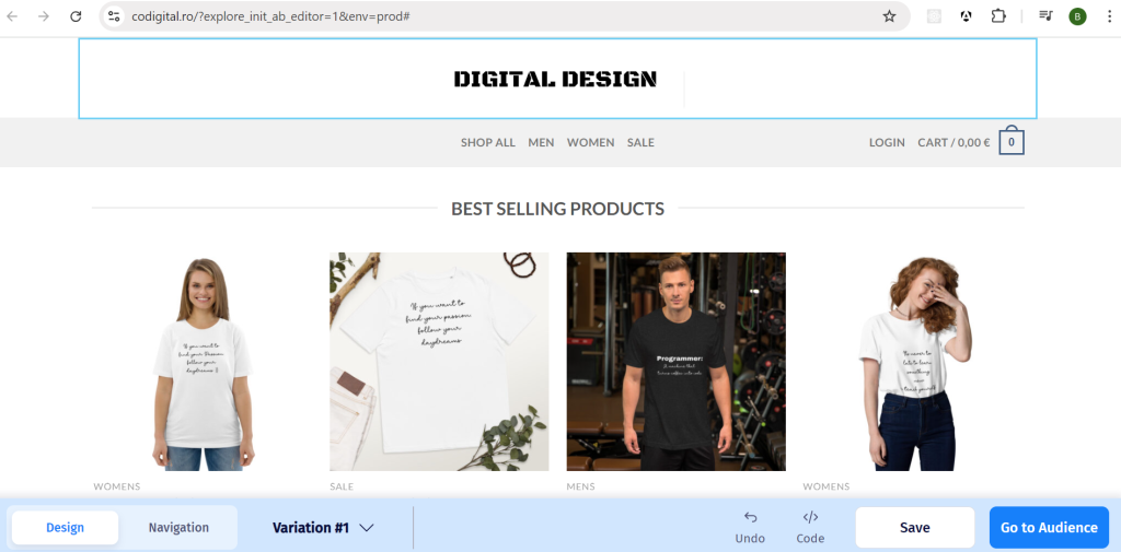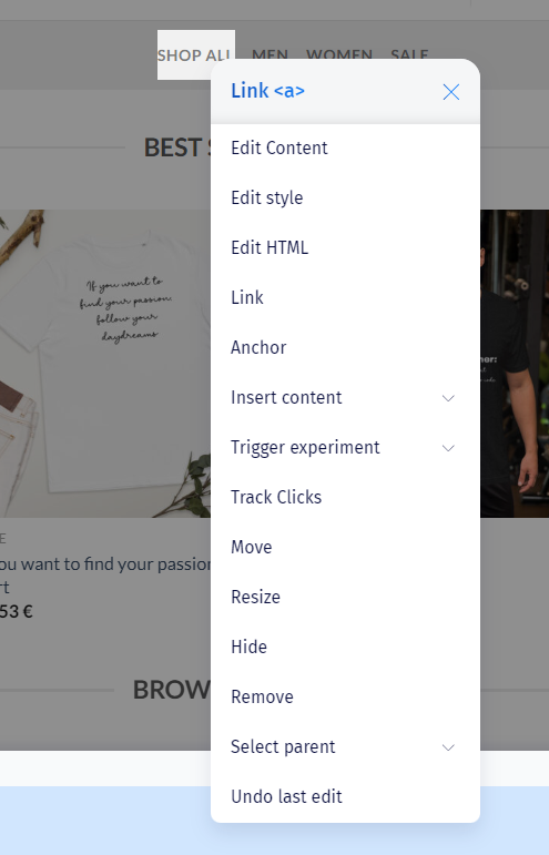 Once you enter the Visual Editor a new page will open containing the URL you have previously entered, here every time you hover your mouse over a page element (image, link, piece of text, etc.) inside the variation, you will be able to edit it.