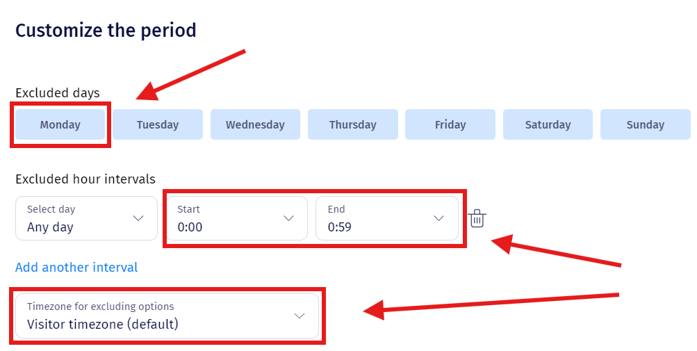 You can also set up excluded timeframes, either by selecting specific days or specific hours throughout the day. By default the Excluded hours intervals are not displayed but it will appear once you press the Add another interval button. The timezone options represents the timezone which should apply to the hour intervals you have selected previously.