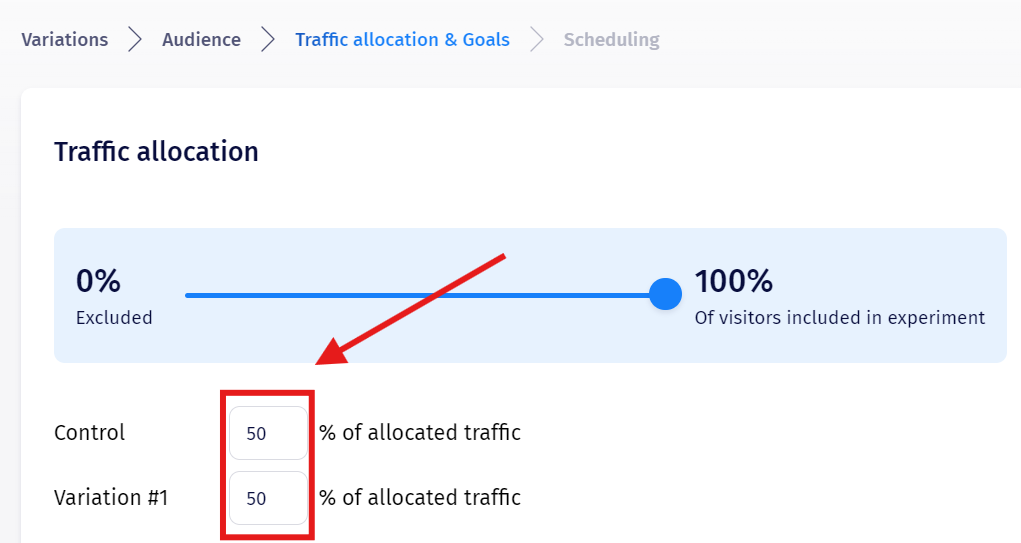 By changing the values of the allocated traffic you can decide how the users will be split between Control and Variation.