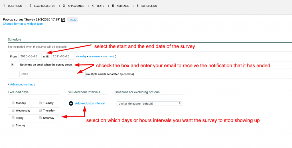 Choose for how long to set it live, when to be triggered to your visitors and whether or not you want to receive an email when it has expired.