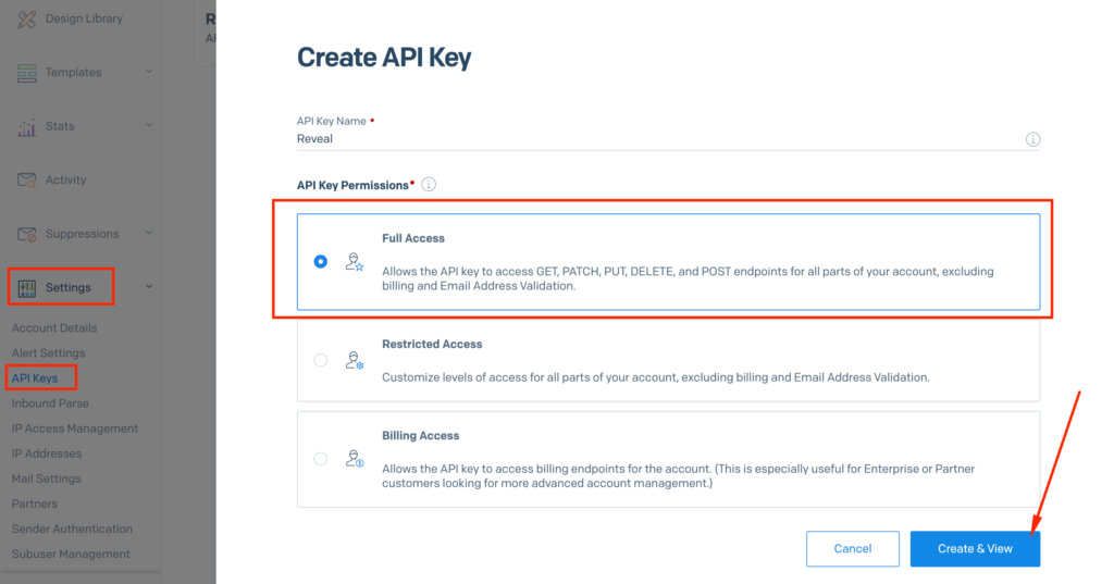 - API Key: you can generate an API Key by accessing the SendGrid interface > Settings > API Keys > Create API Key. Please create an API Key with Full Access permissions and make sure you copy your API Key value since afterwards you will not be able to access its value.