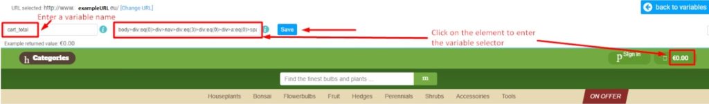 To create a new total cart amount variable, click on the element on the page that holds the value and the selector will be automatically created. Then press ‘Save’.