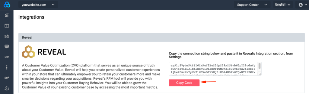 Copy the connection string for the Reveal integration from the Integrations page by clicking on the “Copy Code” button: