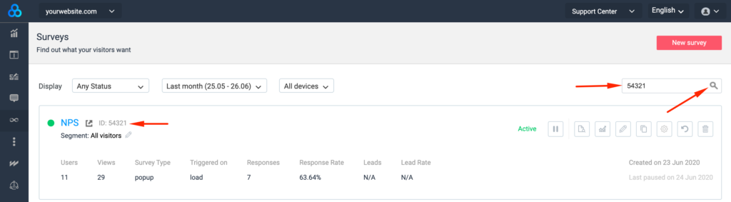Paste the ID in the search box and click on the search icon. The survey matching the search criteria will be returned: