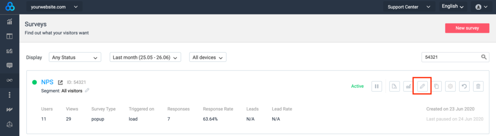 If you have used the surveys in Explore before, you might have multiple surveys, so you need to check which survey you need to edit and for this you need to check in Reveal the Survey ID in Store Settings > General > NPS section > NPS > Click on the pencil button to edit: