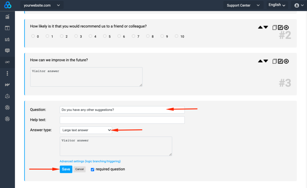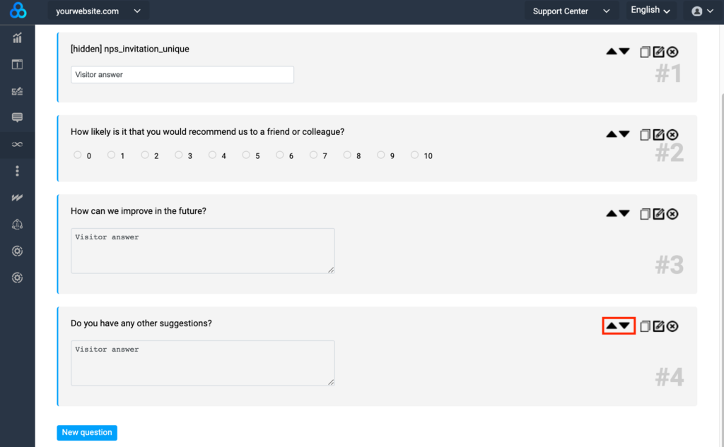 If you need to rearrange your questions, all you have to do is move them using the arrows next to each question, but please check the “Prerequisites for the NPS Survey to work correctly” before doing so: