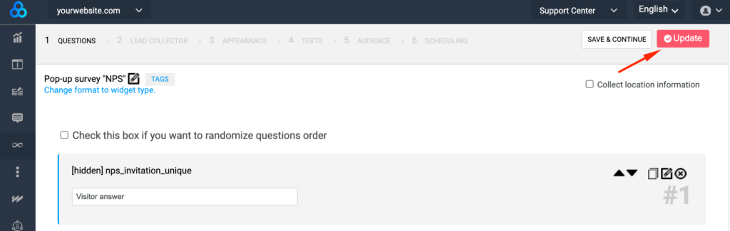 First of all, it is important to make sure that the first question is the hidden question containing the NPS invitation unique, for NPS surveys sent via email, and the order number extracted from the thank you page, for Pre-Delivery NPS. So, if you decide to add more questions or edit anything, bear in mind that the hidden question must be the first one and it shouldn’t be edited.