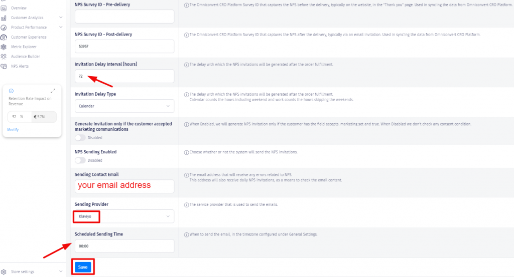 Only after you have completed all the NPS related settings, the Explore survey is ready and the Klaviyo template is also complete, you must enable the module, by choosing “Enable” for NPS Sending Enabled.