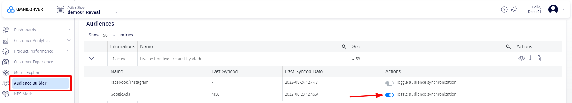 Now that Reveal is connected with your Google ADs account, the only thing remaining to do is to access your Audience Builder section and toggle on the Google Ads synchronization for each of the wanted audiences.